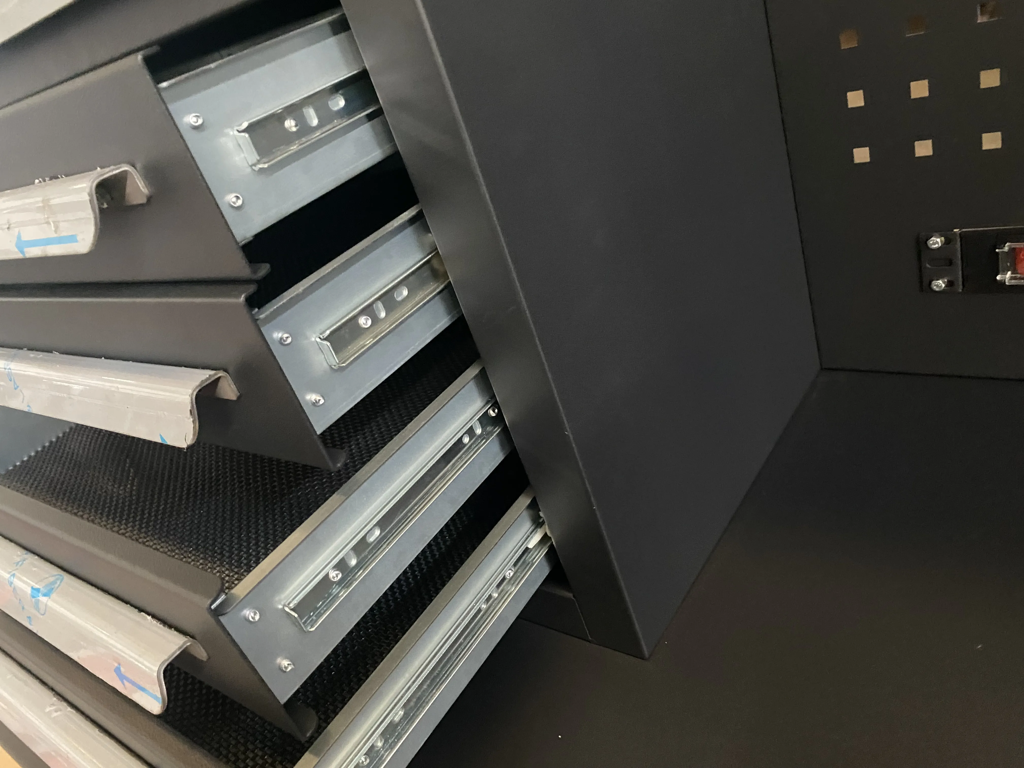 L'armadietto degli attrezzi è lungo 2550 millimetri. Lo spessore, il colore, le dimensioni e i cassetti possono essere personalizzati in base alle esigenze dei clienti. Sia il wrokbench che i cassetti sono realizzati in acciaio arrotolato a freddo. Ci sono due centrali elettriche qui. I cassetti sono dotati di luci a LED, le luci a LED possono essere appese al pannello a rete che facilitano l'illuminazione quando si lavora sul banco di lavoro. Ci sono cuscini nei cassetti, che possono ridurre efficacemente i graffi.