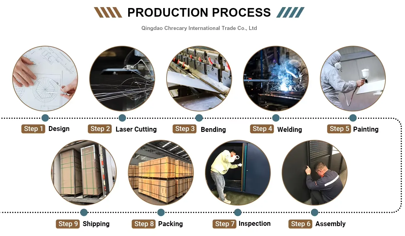 1. Approvvigionamento di materie prime: le piastre di acciaio a freddo di alta qualità sono accuratamente selezionate come materiale principale per garantire che la resistenza e la resistenza del materiale soddisfino gli alti standard. Allo stesso tempo, vengono acquistati vari materiali ausiliari di alta qualità, come scivoli per cuscinetti a sfere per cassetti, serrature e ruote.
